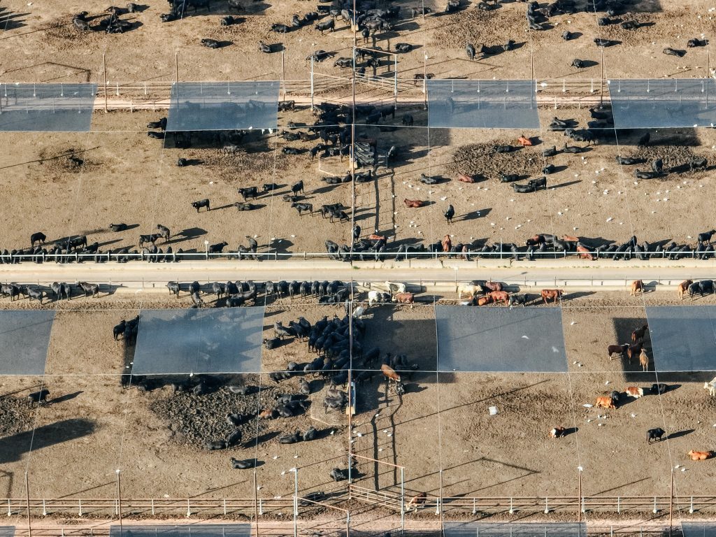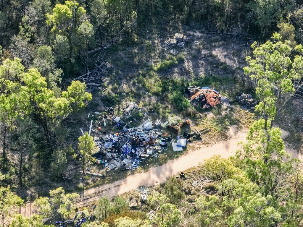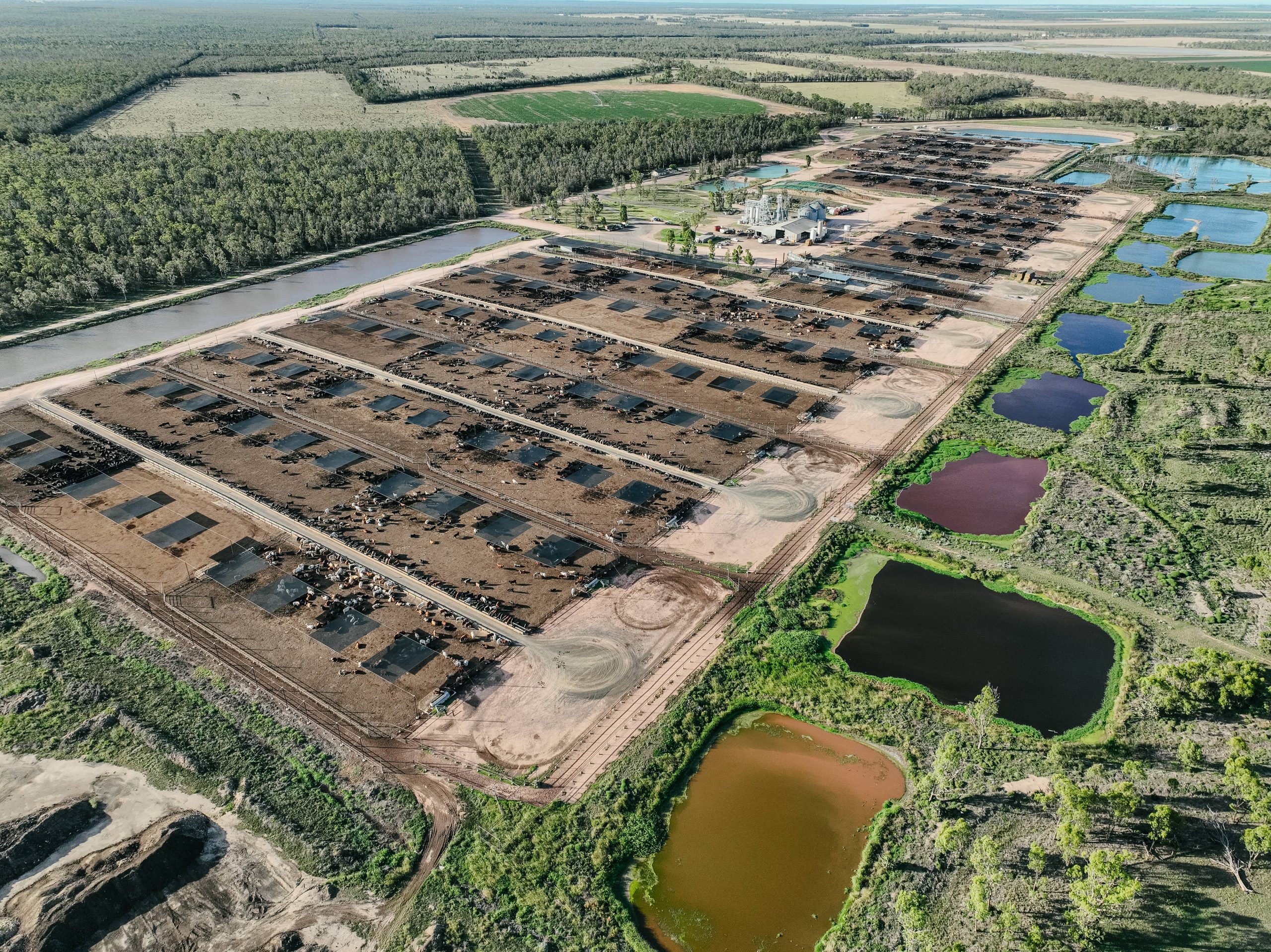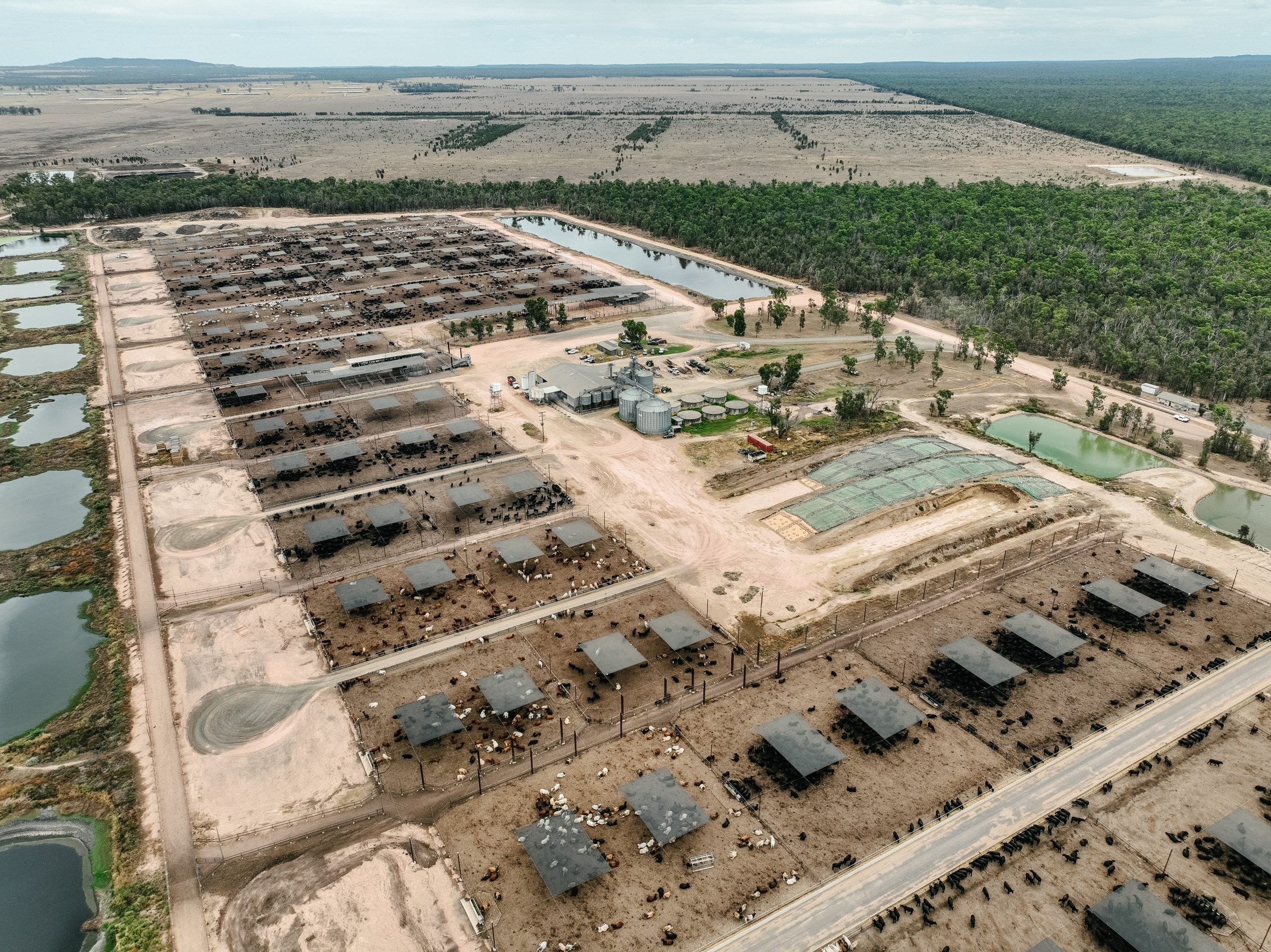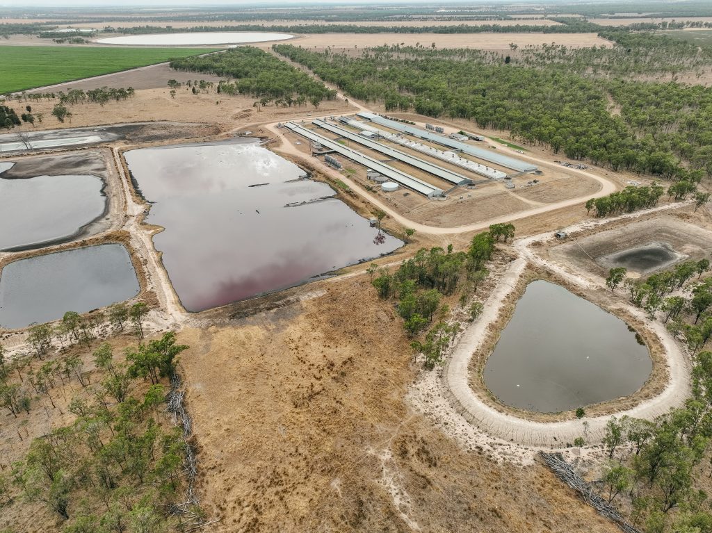 Pinegrove Feedlot is located on Barunggam country in the Toowoomba region of Queensland. This feedlot is owned and operated by Mort & Co, who also operate Grassdale Feedlot. This feedlot has a current capacity of around 9,700, but is licensed to double in size to 21,000. Most of the pens at Pinegrove house Black Angus cows, who are fed for a minimum of 365 days. On the day that we visited the feedlot, there appeared to be a lot of green algal water surrounding the effluent ponds, and a carcass being predated upon by wildlife. There was also a large pile of rubbish in the woodlands near the feedlot.