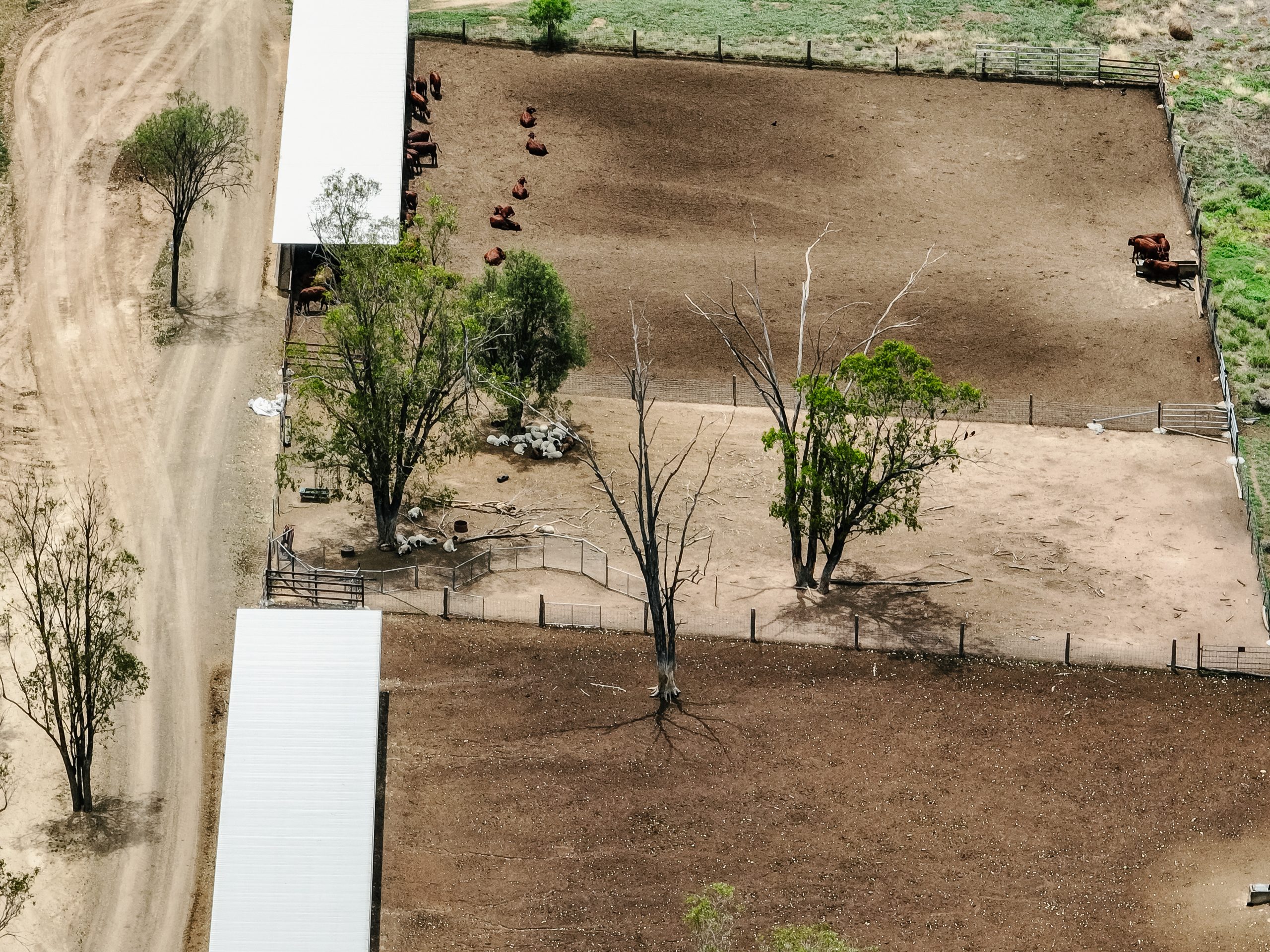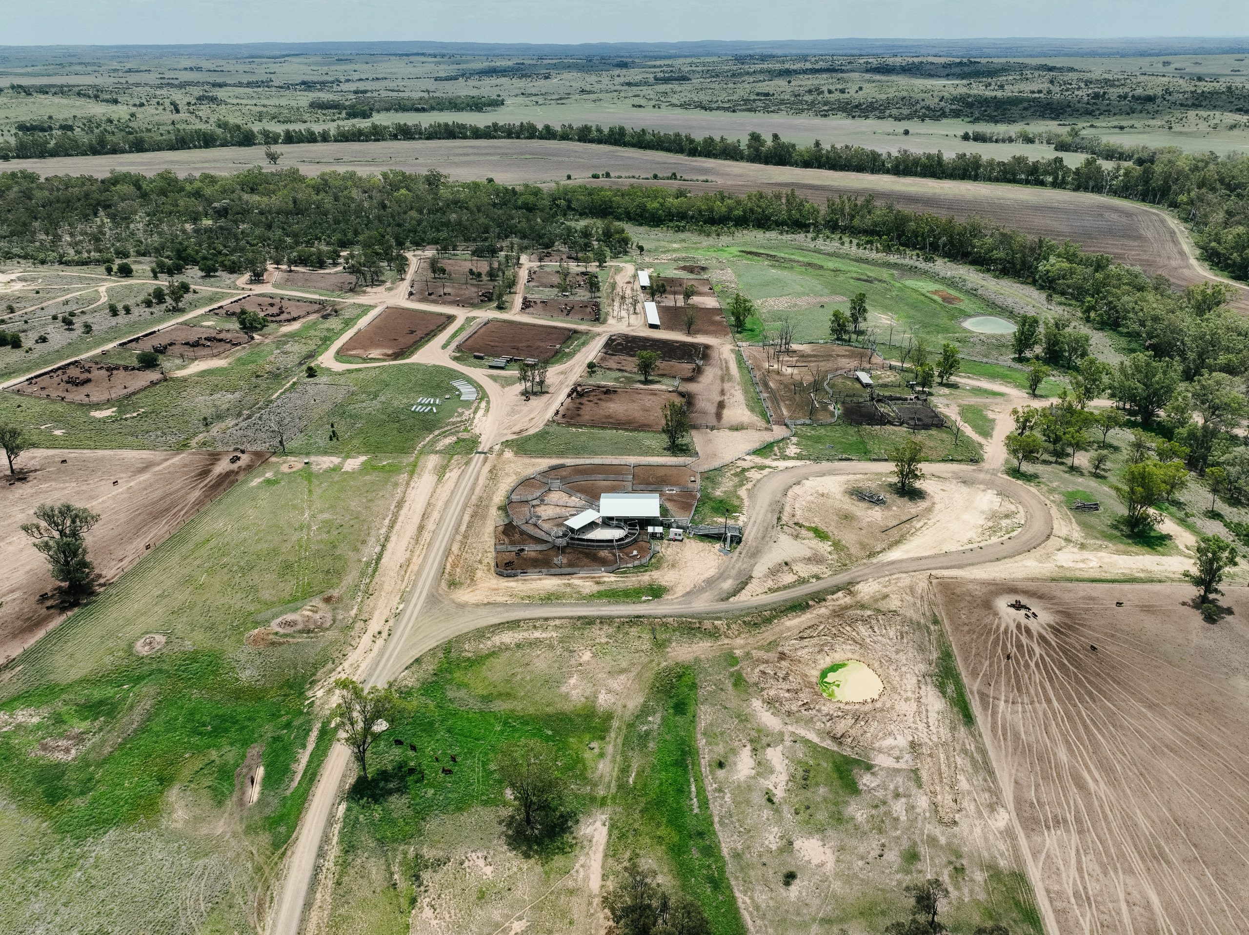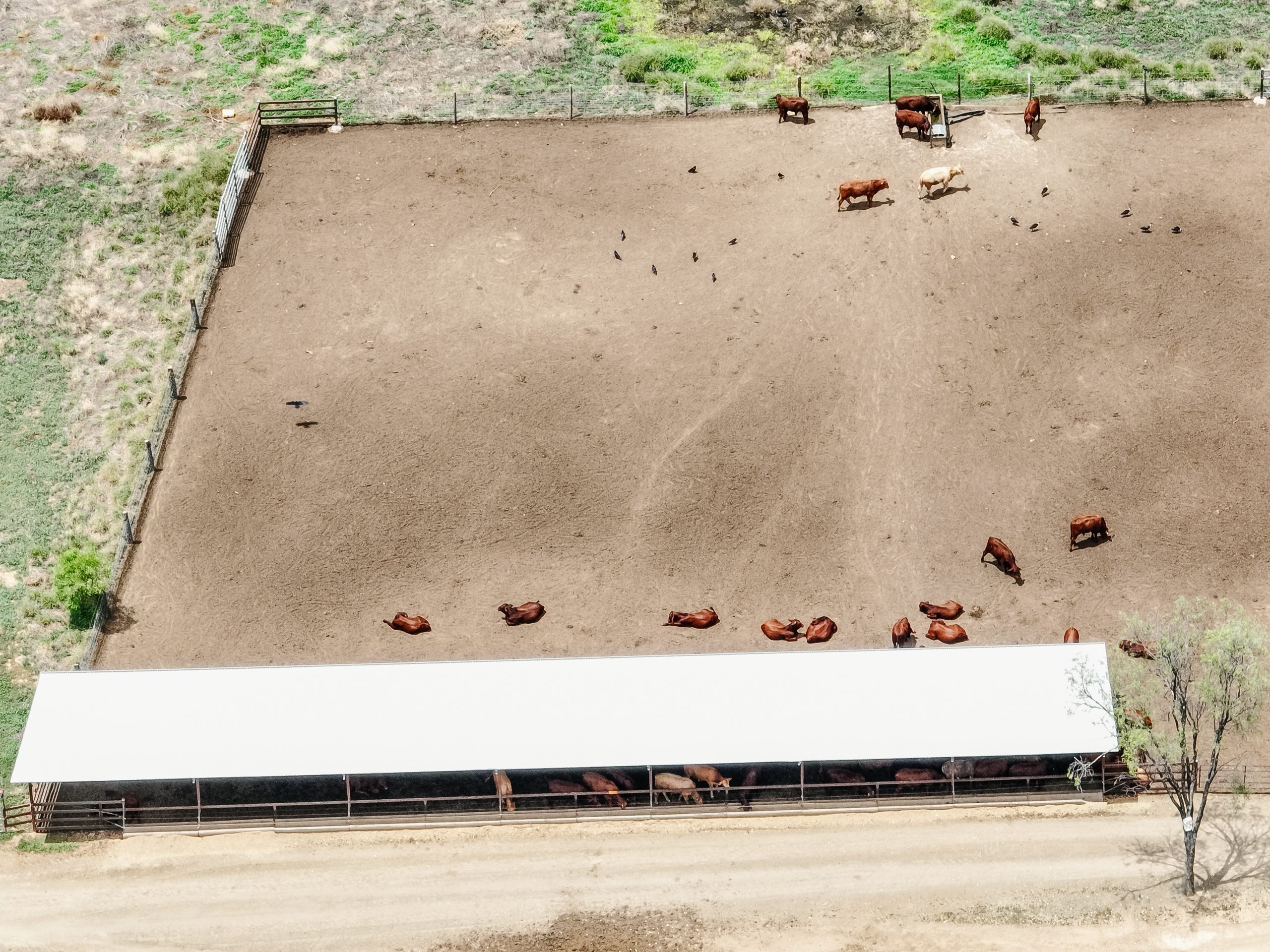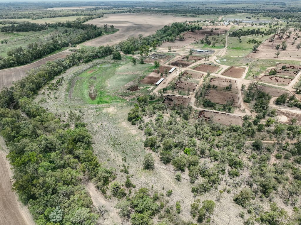 Spion Kop Feedlot is located on Yiman country, near Taroom in the Banana region of Queensland. This small feedlot is situated just 40 metres from Eurombah Creek, and the entire feedlot is mapped as a flood hazard area. On the day we visited the feedlot, we observed what appeared to be algal blooms in all of the water bodies on the property, including Eurombah Creek. There are small shade structures in two pens, and a few scattered trees, but most of the cows do not have access to shade or shelter. On the day the footage was taken, there were sheep in one of the feedlot pens.
