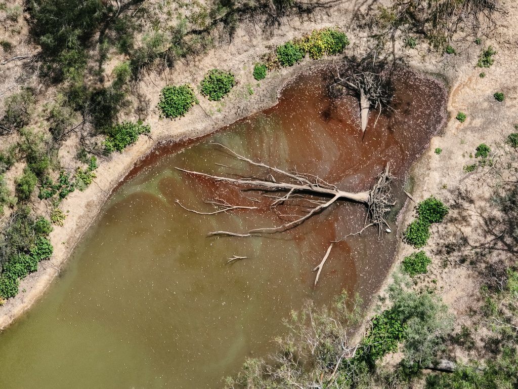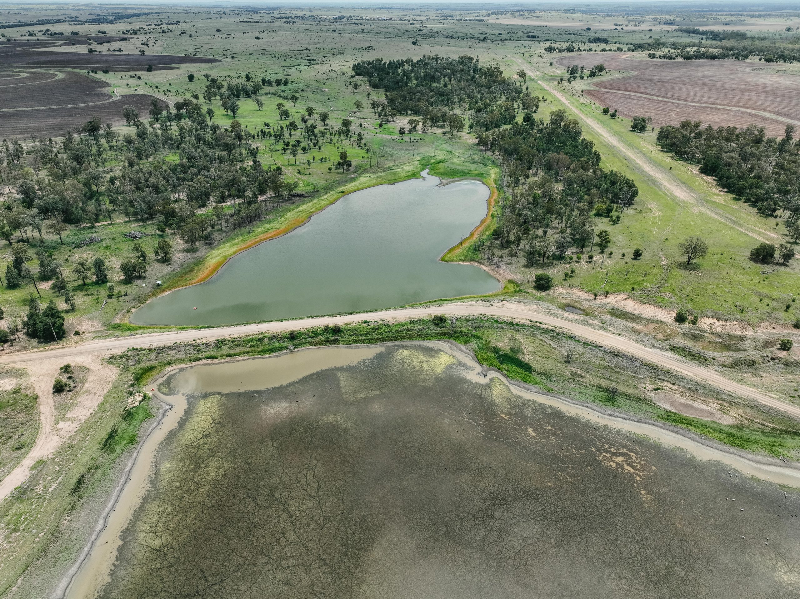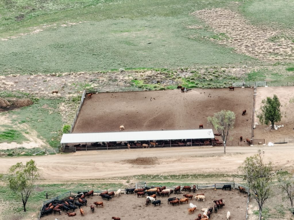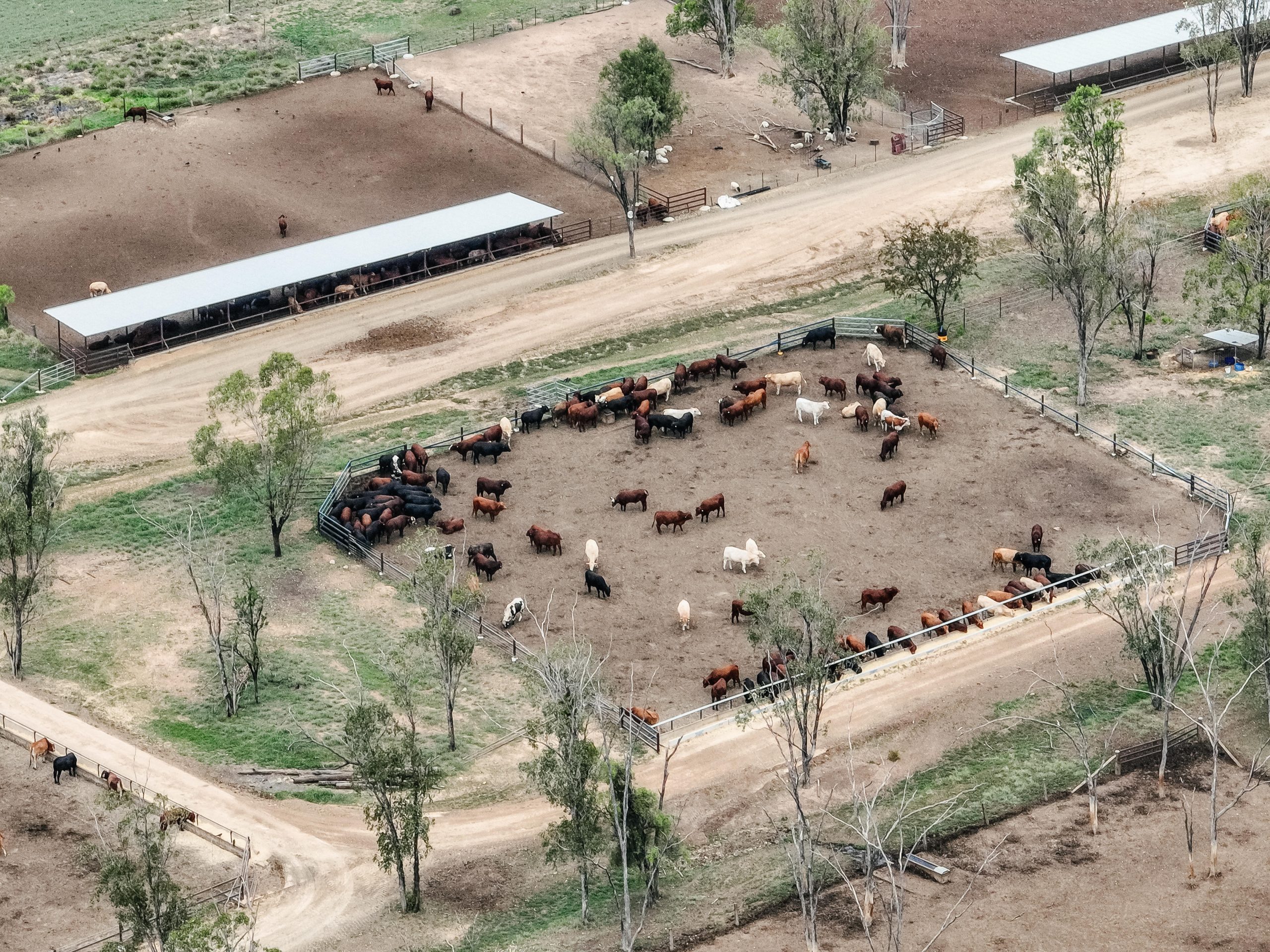 Spion Kop Feedlot is located on Yiman country, near Taroom in the Banana region of Queensland. This small feedlot is situated just 40 metres from Eurombah Creek, and the entire feedlot is mapped as a flood hazard area. On the day we visited the feedlot, we observed what appeared to be algal blooms in all of the water bodies on the property, including Eurombah Creek. There are small shade structures in two pens, and a few scattered trees, but most of the cows do not have access to shade or shelter. On the day the footage was taken, there were sheep in one of the feedlot pens.