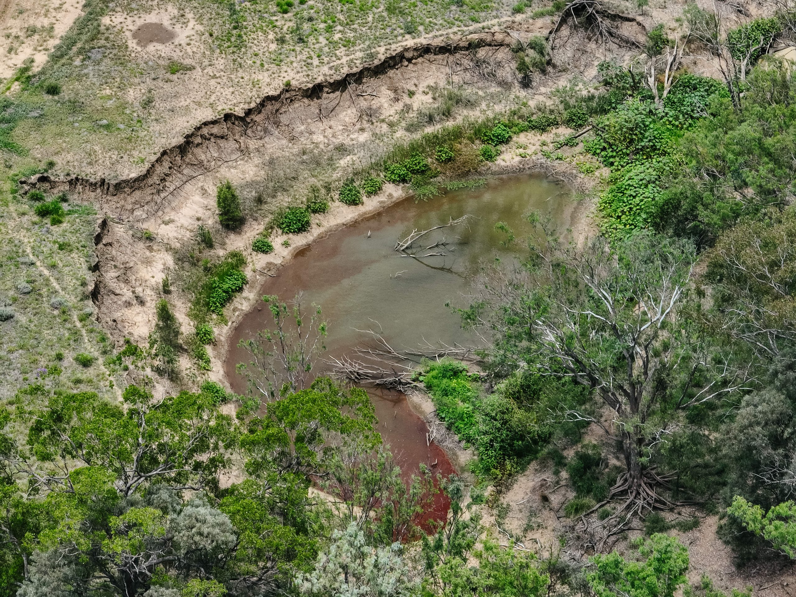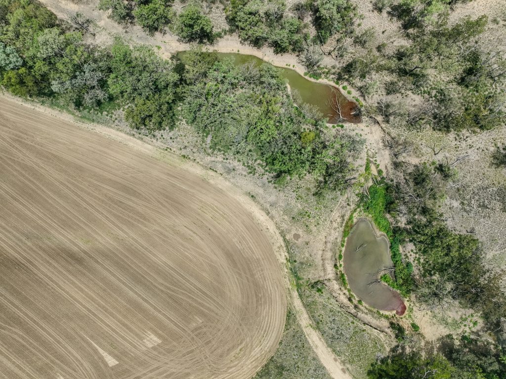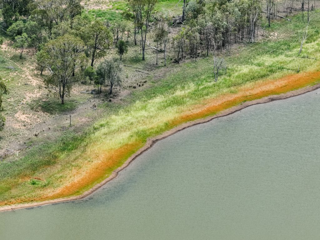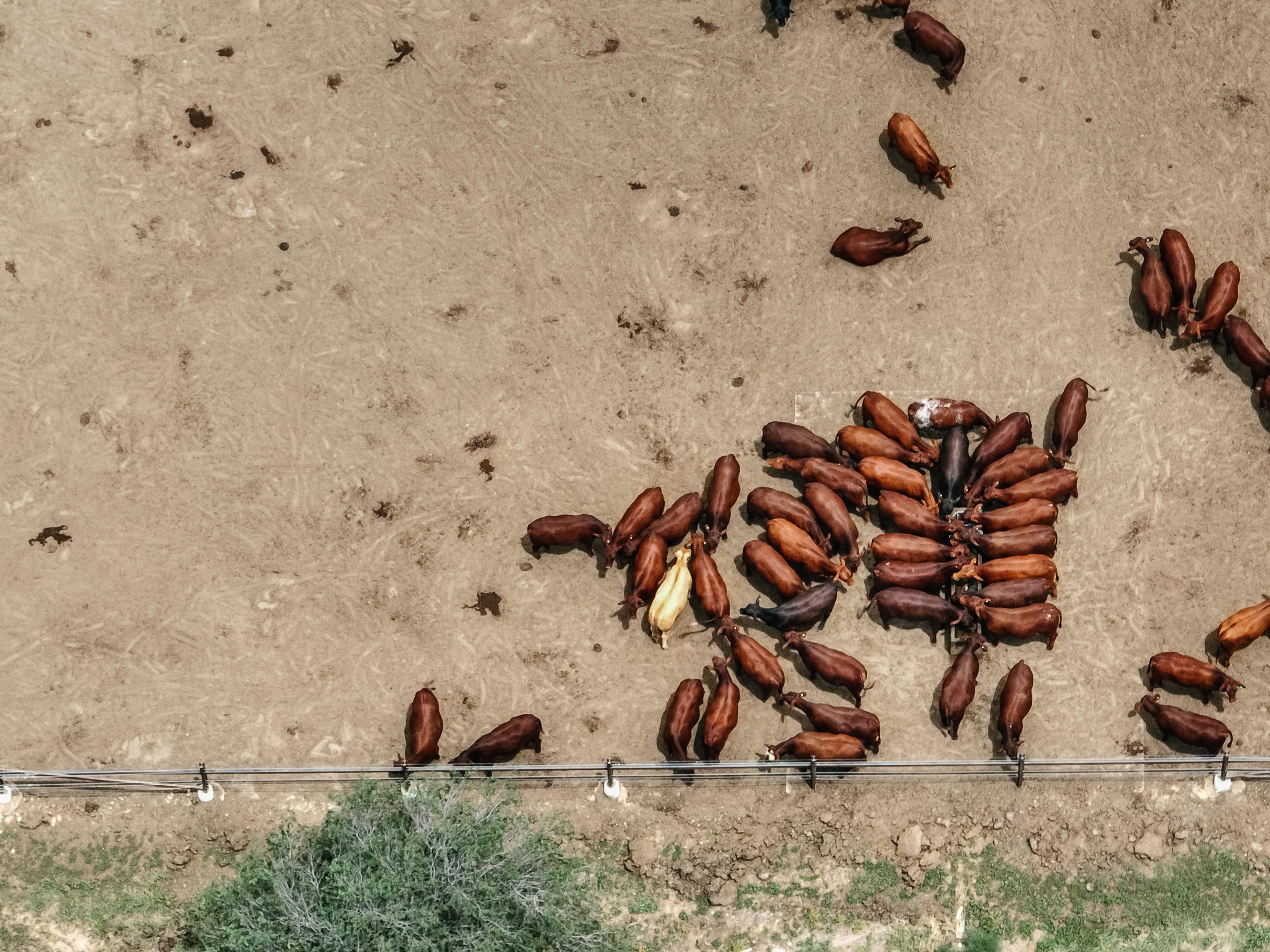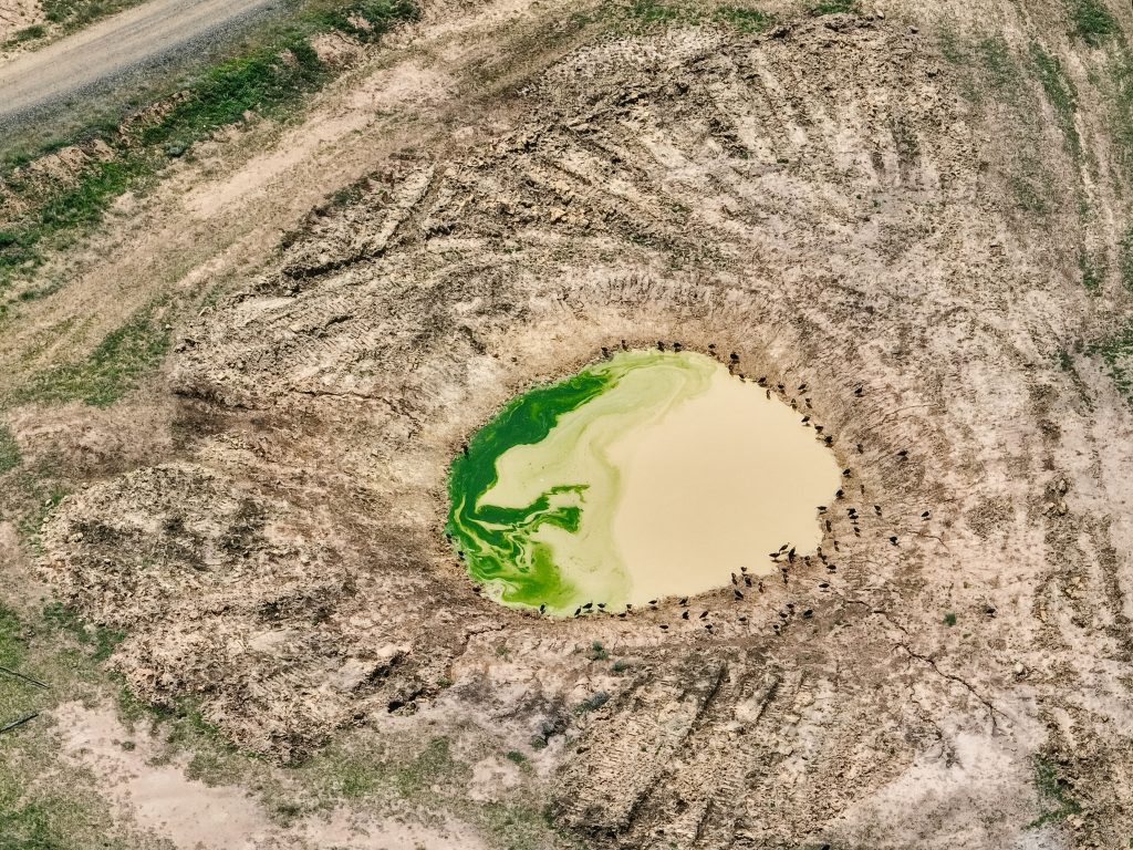 Spion Kop Feedlot is located on Yiman country, near Taroom in the Banana region of Queensland. This small feedlot is situated just 40 metres from Eurombah Creek, and the entire feedlot is mapped as a flood hazard area. On the day we visited the feedlot, we observed what appeared to be algal blooms in all of the water bodies on the property, including Eurombah Creek. There are small shade structures in two pens, and a few scattered trees, but most of the cows do not have access to shade or shelter. On the day the footage was taken, there were sheep in one of the feedlot pens.