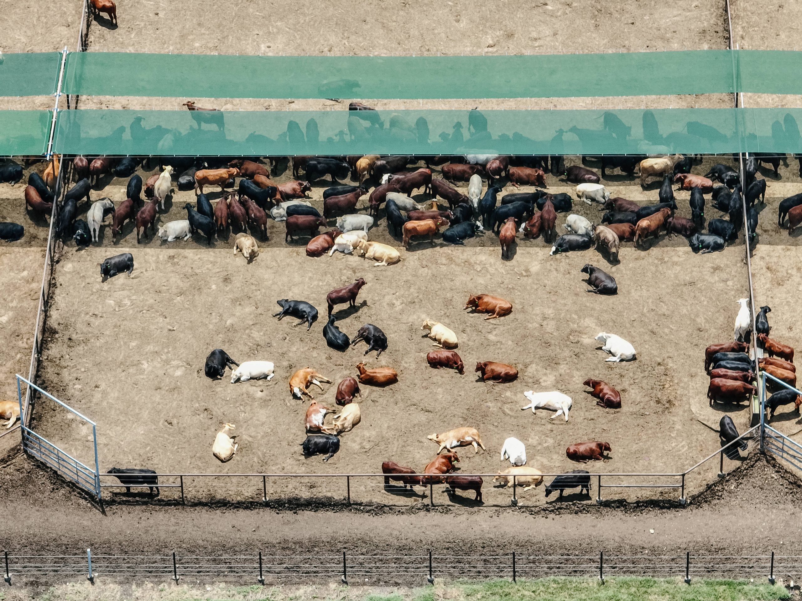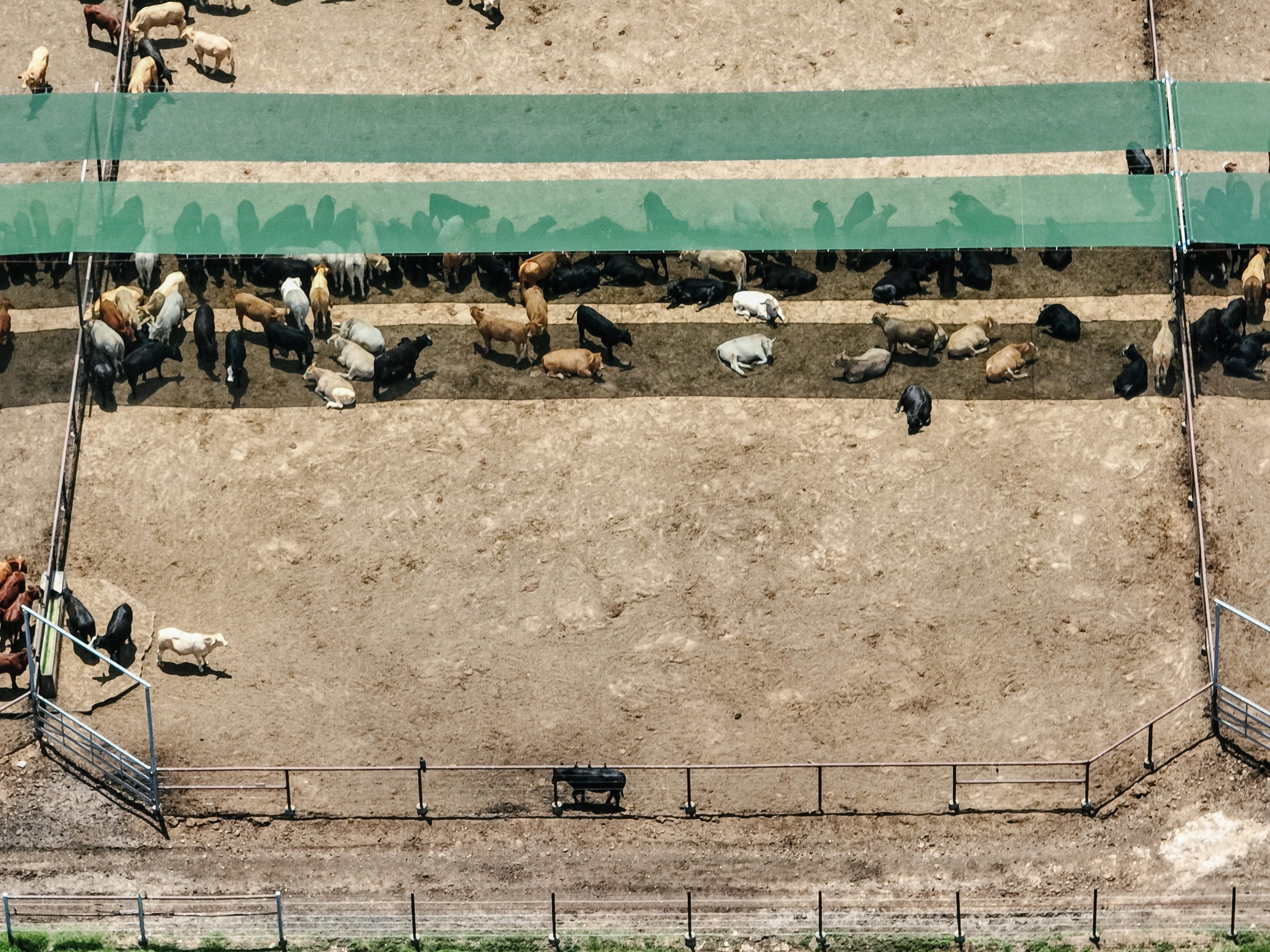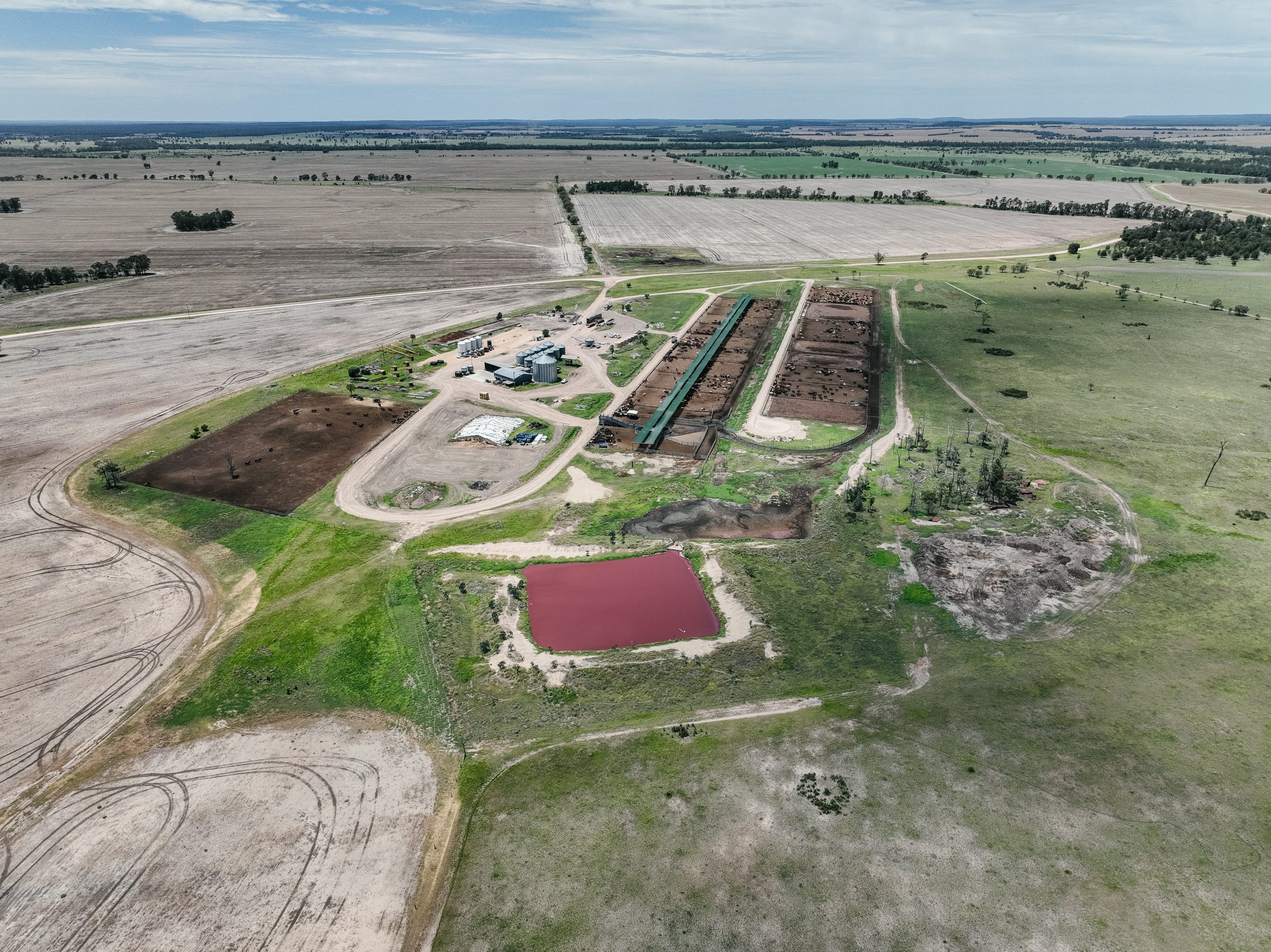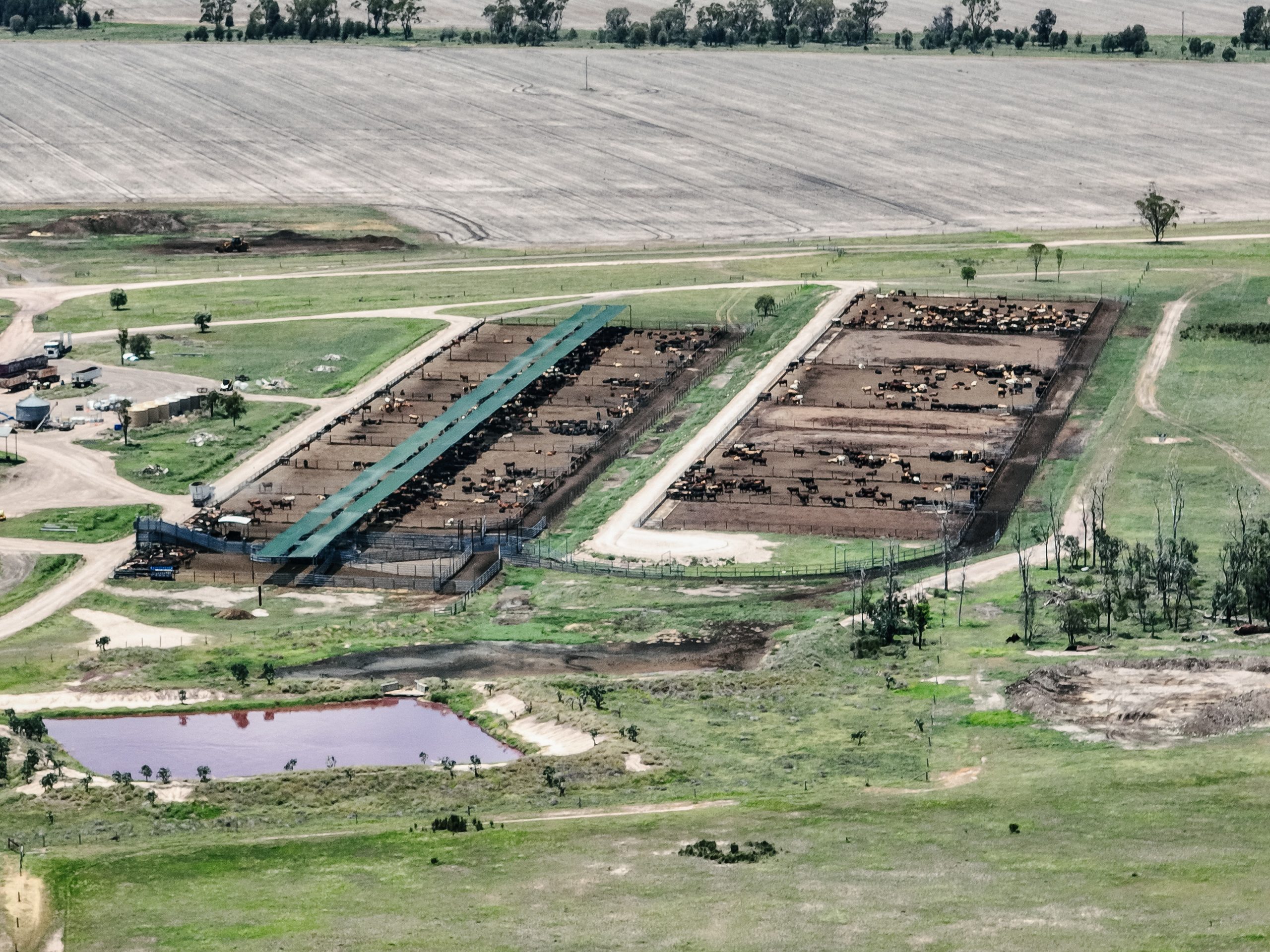 Talbingo Feedlot is located on Barunggam country, near Tara in the Western Downs on Queensland. This small feedlot has some shade structures, but they are not wide enough for all cows, and are not available in all pens. On the day that we visited the feedlot, we observed a lot of bones along with what appeared to be burnt earth on the compost piles. We also witnessed the cows pushing and shoving to get near the food troughs.