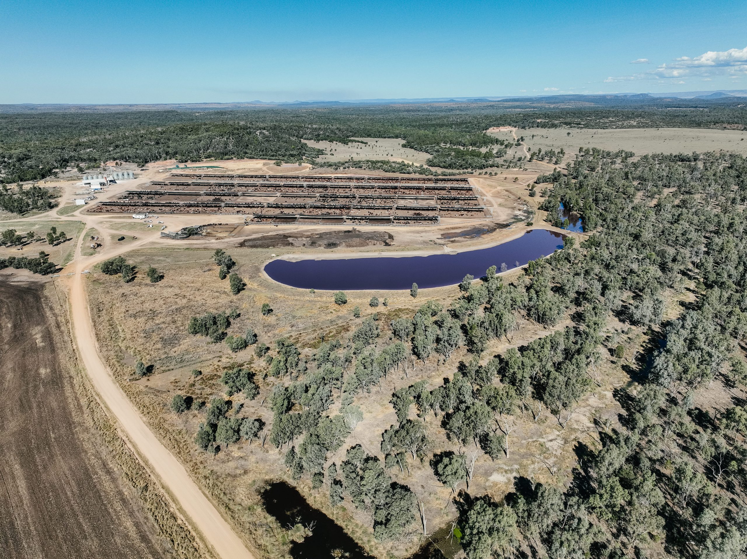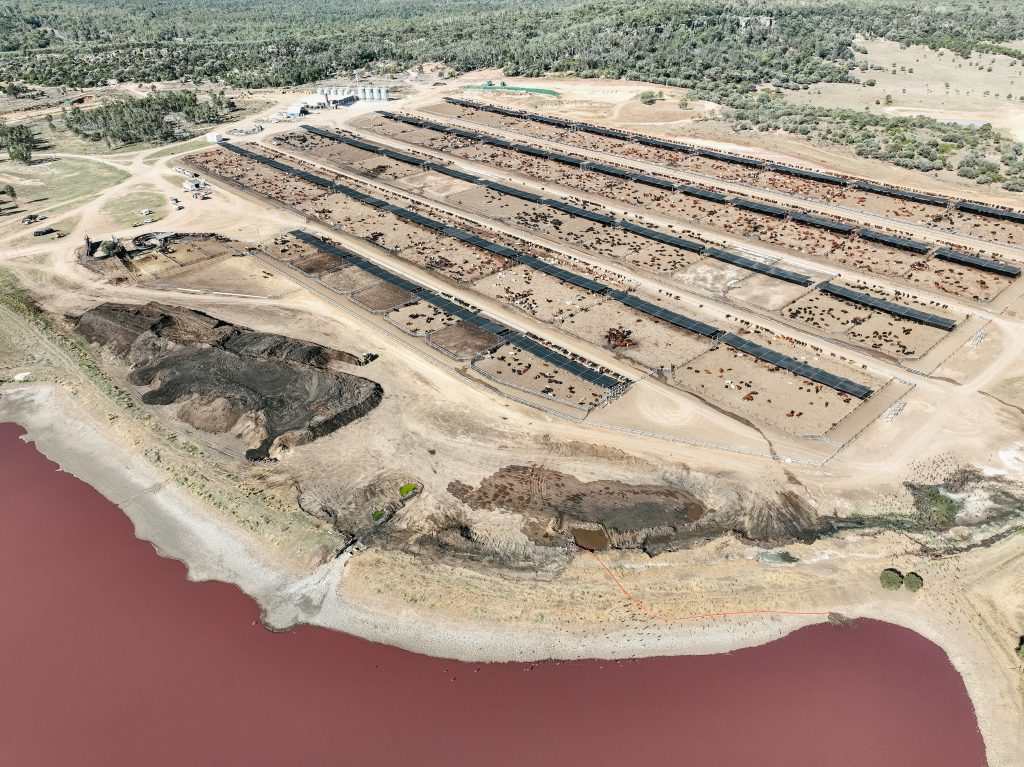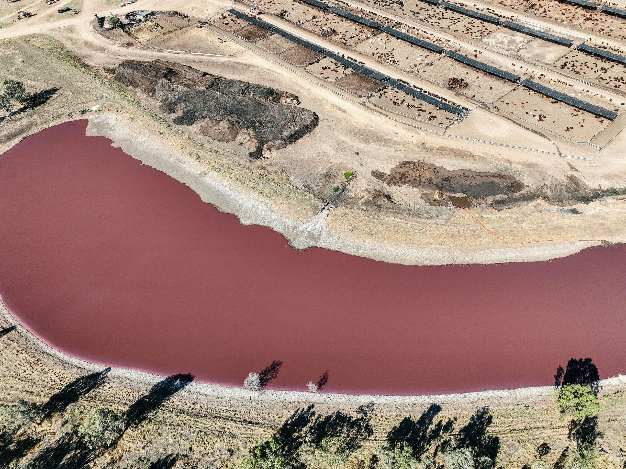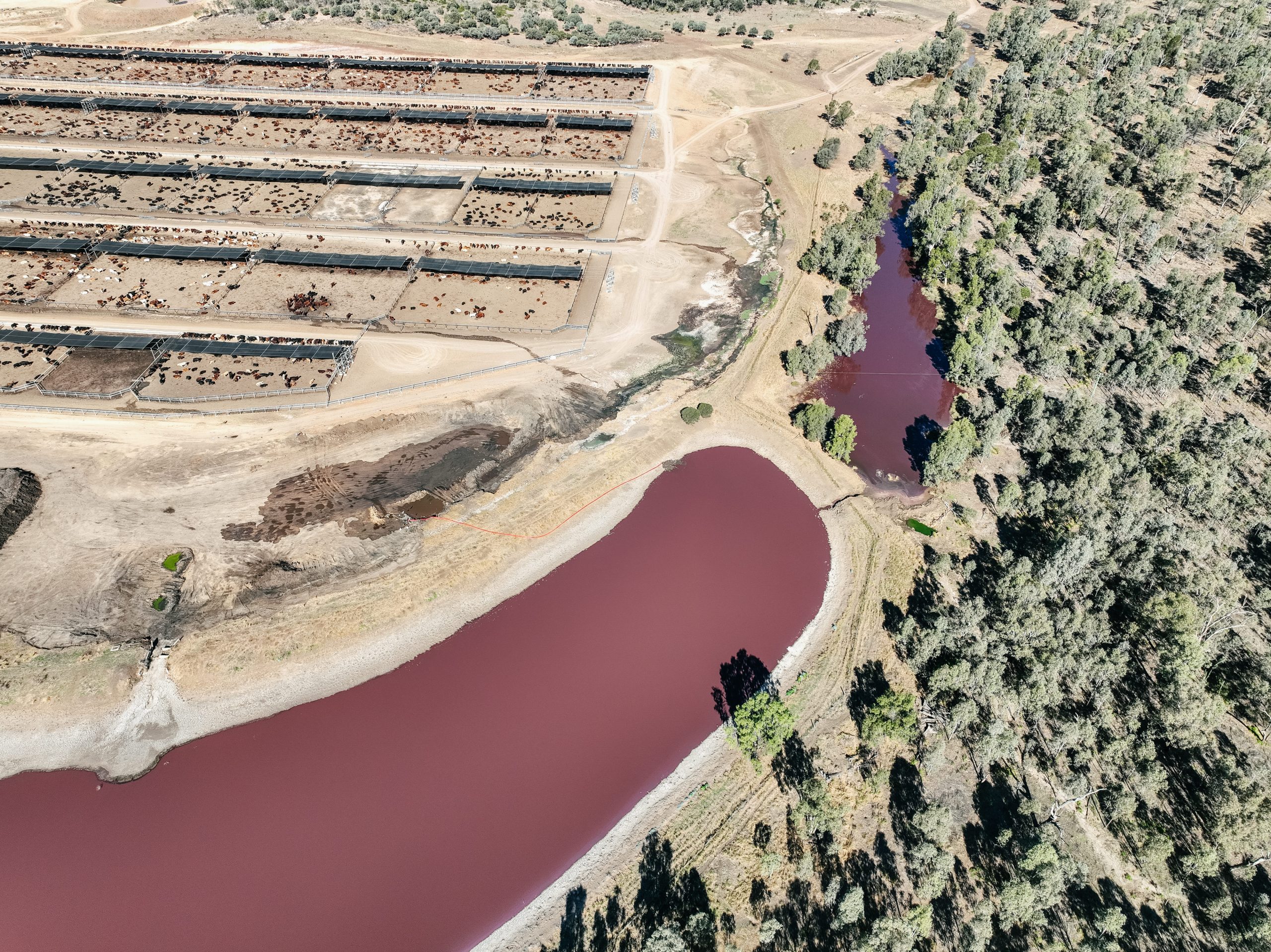 Vandyke Feedlot is located on Gayiri country near Springsure in the Central Highlands region of Queensland. This feedlot is owned and operated by Allied Beef. The feedlot is situated just 500 metres from Sandy Creek, and 1 km from Vandyke Creek, and the entire feedlot is mapped as a flood hazard area. On the day that the footage was taken, we witnessed domestic pigs eating the bodies of dead cows, effluent being drained out of the ponds, large piles of what appeared to be sludge and electric prods being used to move cows in the yards.